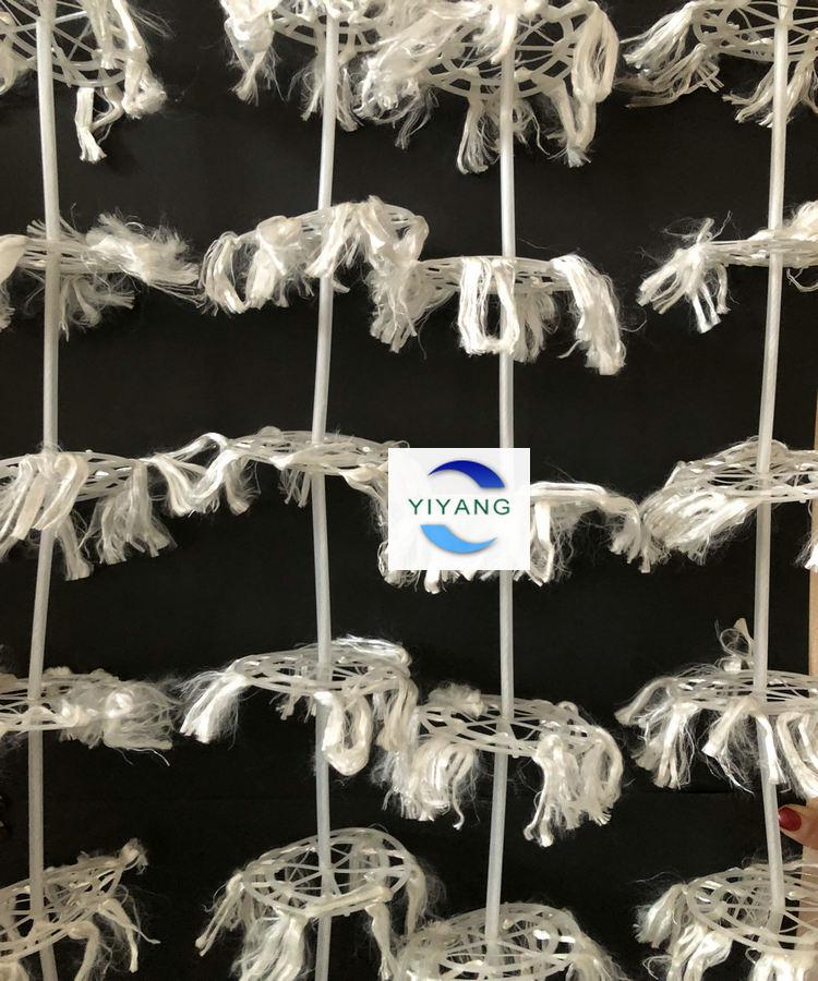 組合式填料又叫做組合式多孔環(huán)掛膜填料,產(chǎn)品由塑料環(huán)、維綸絲、中心塑料繩組成,產(chǎn)品材質(zhì)為全塑型夾片維綸醛化絲。成串狀的組合式填料每條上面有多個(gè)組合式填料片分布,有固定間距8公分、10公分。每束維綸絲串通4個(gè)方形孔,這樣醛化絲在塑料環(huán)上的牢固度就比較高了,在強(qiáng)大的曝氣湍急的水氣流的情況下,仍然能正常工作。